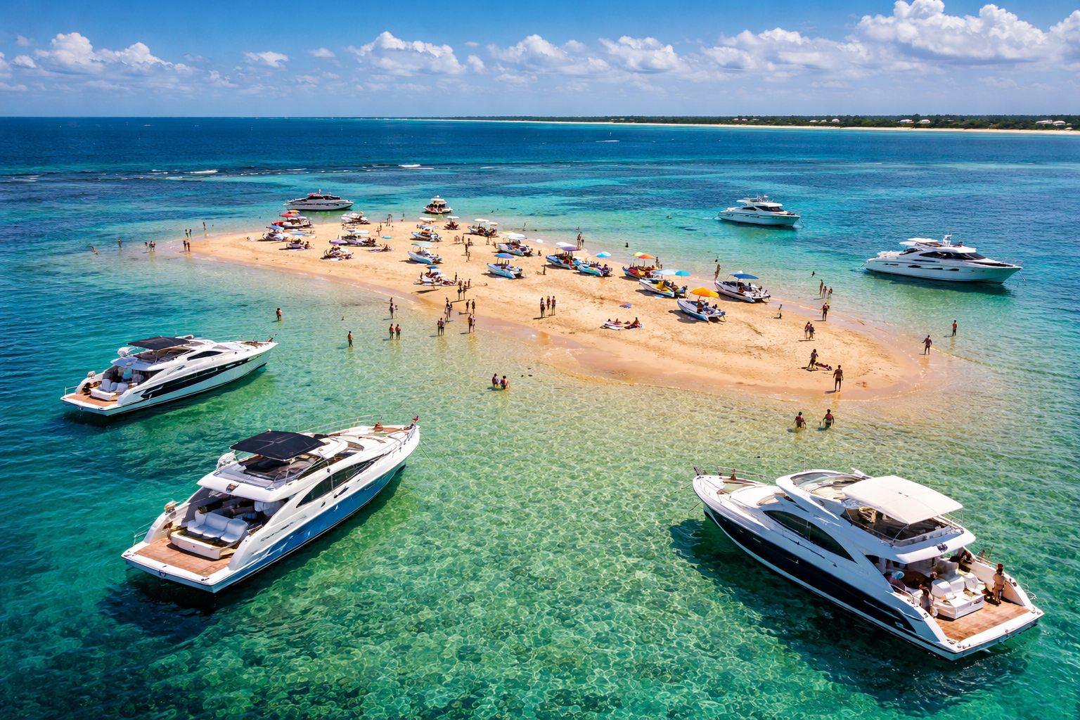 Água morna, cristalina, quase sem ondas. Pessoas relaxando, crianças brincando, o sol refletindo no fundo claro do oceano.
